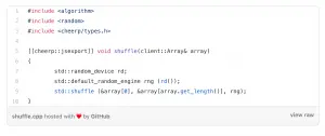The C++ function has been compiled to JavaScript. You can still recognize what’s happening, there are few casts to integer (to force JavaScript to use 32-bit integers instead of 64-bit floating point math), a loop, a modulo calculation, a swap. Basically the original algorithm has been translated into JavaScript syntax.